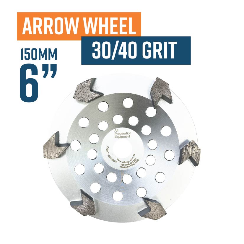 This aggressive diamond wheel is a 30- 40 grit so gives a fast removal on all glues, paint, high spots and render. Providing a fast grinding speed on concrete and other masonry materials our Arrow Segmented wheels have a very coarse diamond and remove faster , and more aggressively.