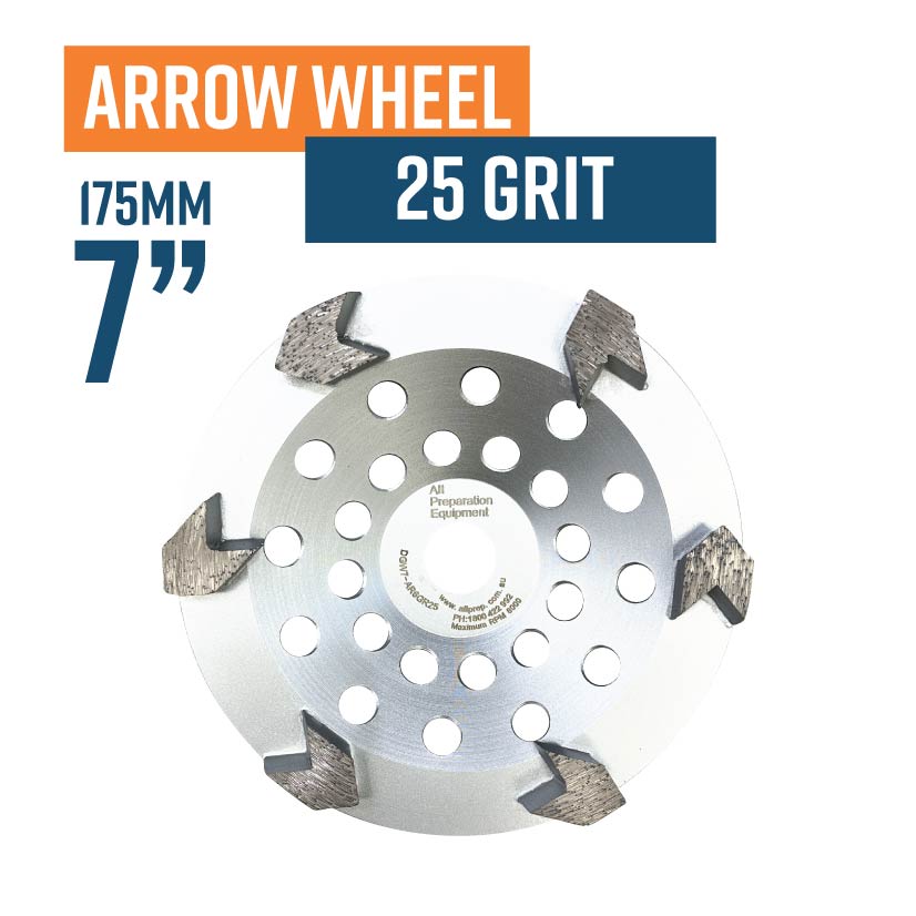 This aggressive diamond wheel is a 25 grit so gives a fast removal on all glues, paint, high spots and render. Providing a fast grinding speed on concrete and other masonry materials our Arrow Segmented wheels have a very coarse diamond and remove faster , and more aggressively.