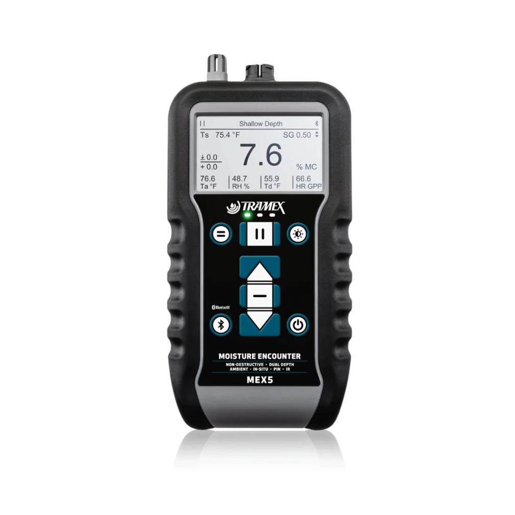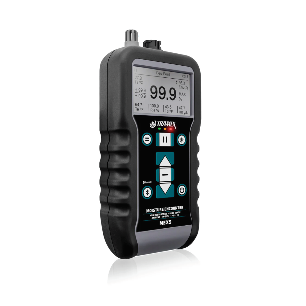The Moisture Encounter MEX5 is Tramex’s most advanced multi-functional moisture and humidity meter, designed for moisture mapping, building surveying, and inspection across a wide range of materials.