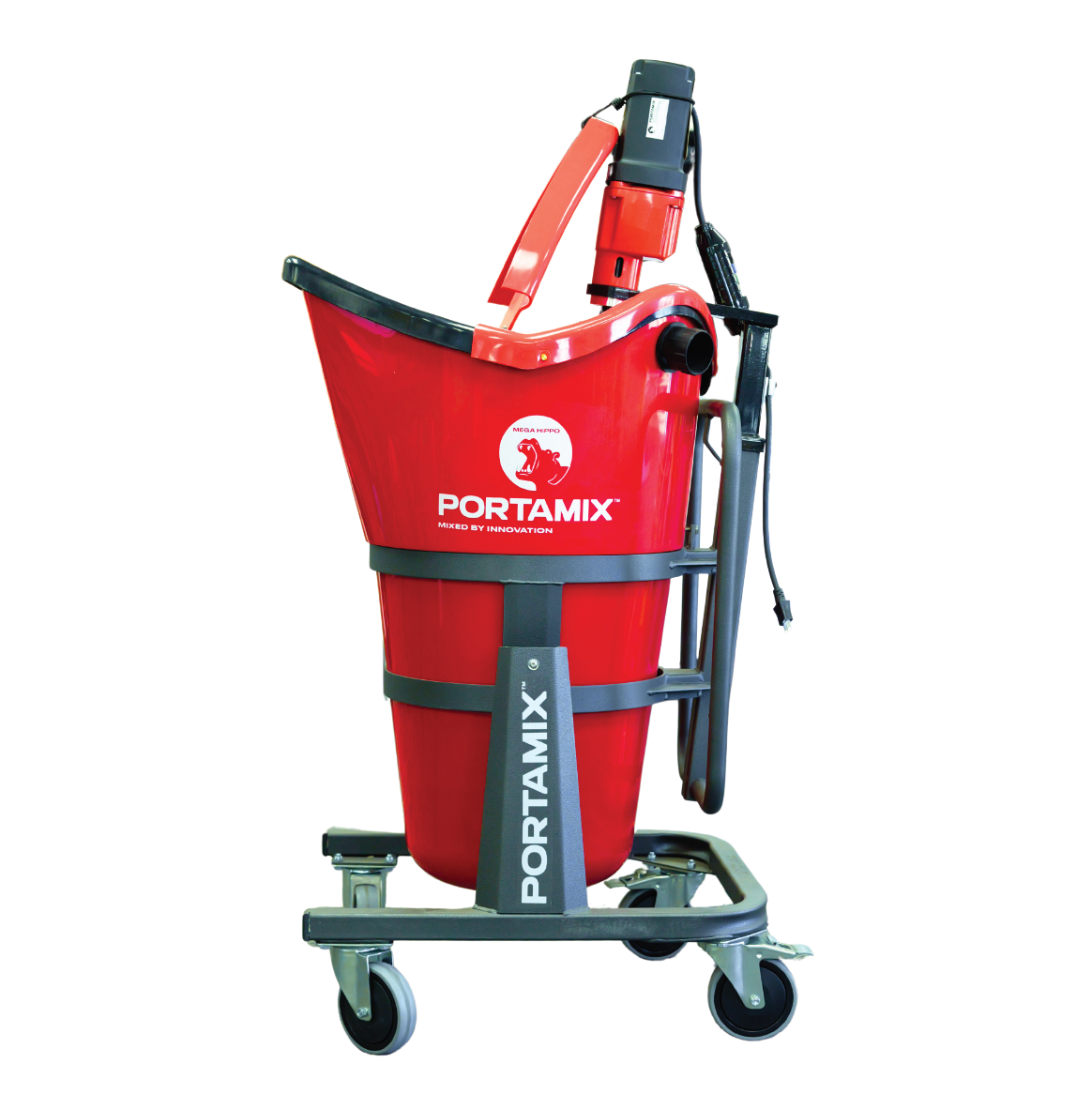 PORTAMIX Mega Hippo Mixer 80L with 1800w High Powered Motor, 2 speed, 6 bag capacity. Includes flexible drum liner, 4x lockable castors, 1x full height paddle, 1x 1/2 height paddle, and BONUS Dust Cover Lid.