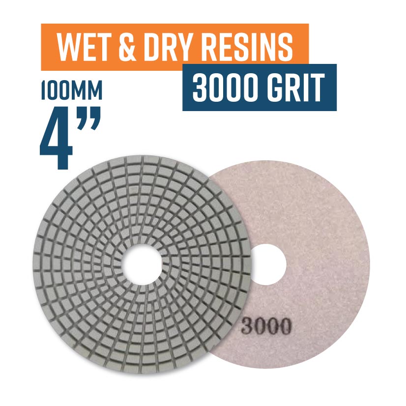100mm (4") Resin Bond Wet & Dry Polishing Pads - 3000 grit. Must be used on low speed(Discontinued item, available while stock lasts - no returns accepted)